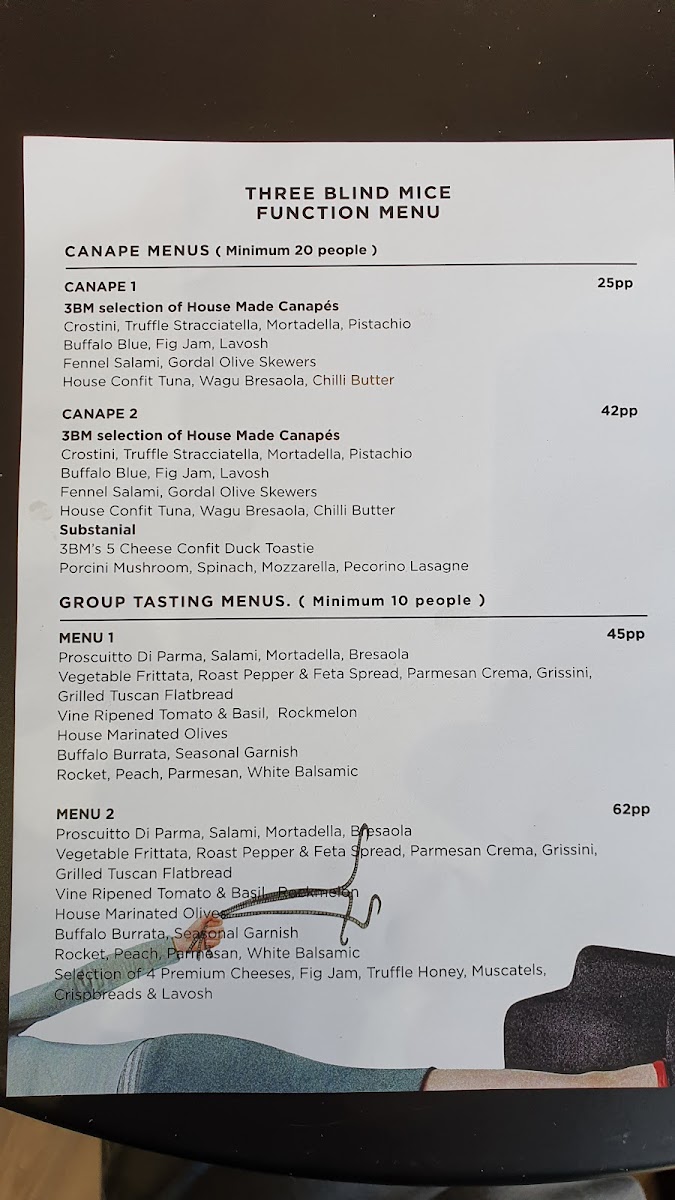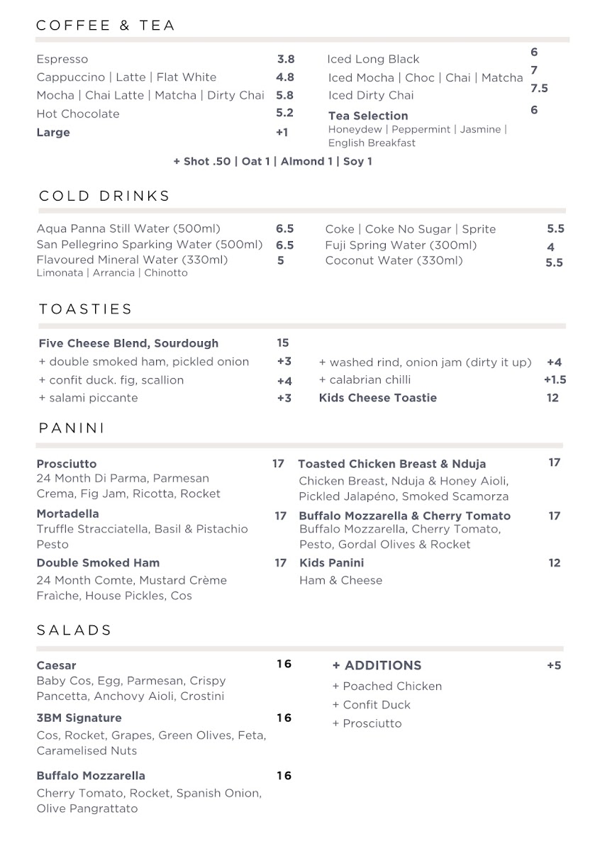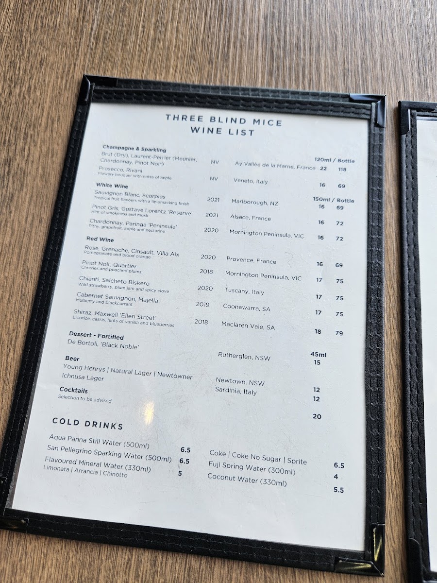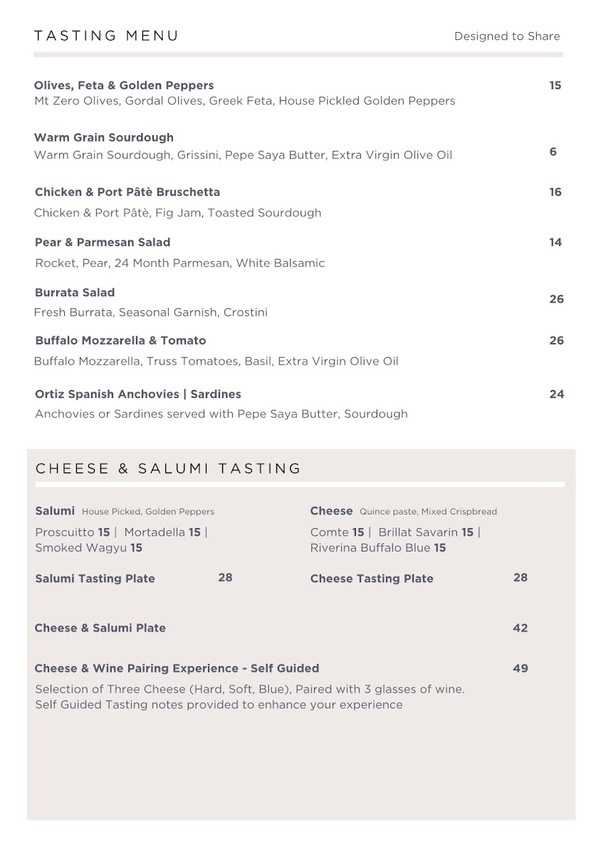 Dining at Three Blind Mice - Providore | Kitchen offers a thoughtfully curated menu that balances casual comfort with refined options. For a simple caffeine fix, the coffee selection ranges from an Espresso to an Iced Dirty Chai, while cold beverages include Aqua Panna Still Water and San Pellegrino Sparkling Water. Light bites are plentiful: Five Cheese Blend and Kids Cheese Toastie for toastie lovers, or paninis like Prosciutto, Toasted Chicken Breast & Nduja, and Mortadella, Buffalo Mozzarella & Cherry Tomato. Salads such as the Caesar, 3bm Signature, and Buffalo Mozzarella provide fresh options alongside hearty pastas like Penne Napolitana, Spaghetti Bolognaise, Fettuccine Fungi, Rigatoni Pesto, and Bucatini Nonna. For sharing, grazing boxes range from Simply Cheese to the indulgent Party Box, complemented by the Canape Menu or tasting selections featuring Olives, Feta & Golden Peppers, Warm Grain Sourdough, Chicken & Port Pâtè Bruschetta, and various salads. Cheese and salumi lovers are treated to plates like the Salumi Tasting Plate, Cheese Tasting Plate, and Cheese & Wine Pairing Experience - Self Guided. The drinks list spans Prosecco, Sauvignon Blanc, Grenache, and fortified wines like De Bortoli 'Black Noble', alongside craft beers such as Young Henrys Natural Lager and Ichnusa Lager. Overall, the menu at Three Blind Mice combines approachable favorites with artisanal touches, making it a versatile spot for casual coffee, a leisurely lunch, or indulgent tasting experiences.