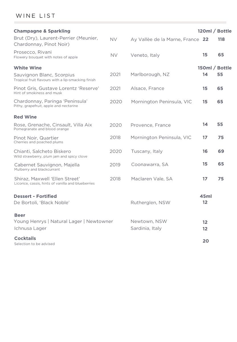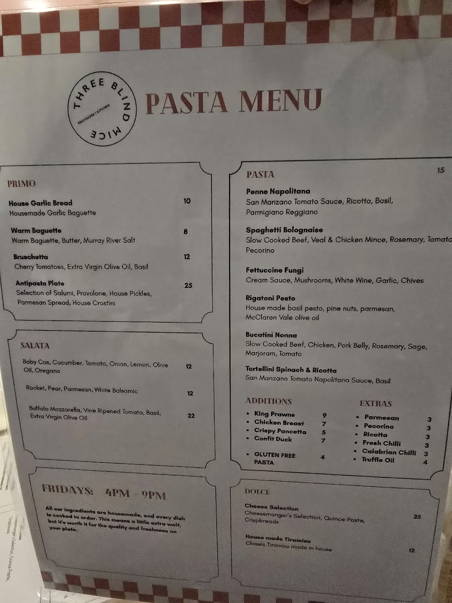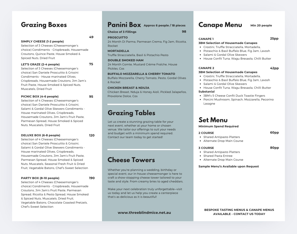 Dining at Three Blind Mice - Providore | Kitchen offers a thoughtfully curated menu that balances casual comfort with refined options. For a simple caffeine fix, the coffee selection ranges from an Espresso to an Iced Dirty Chai, while cold beverages include Aqua Panna Still Water and San Pellegrino Sparkling Water. Light bites are plentiful: Five Cheese Blend and Kids Cheese Toastie for toastie lovers, or paninis like Prosciutto, Toasted Chicken Breast & Nduja, and Mortadella, Buffalo Mozzarella & Cherry Tomato. Salads such as the Caesar, 3bm Signature, and Buffalo Mozzarella provide fresh options alongside hearty pastas like Penne Napolitana, Spaghetti Bolognaise, Fettuccine Fungi, Rigatoni Pesto, and Bucatini Nonna. For sharing, grazing boxes range from Simply Cheese to the indulgent Party Box, complemented by the Canape Menu or tasting selections featuring Olives, Feta & Golden Peppers, Warm Grain Sourdough, Chicken & Port Pâtè Bruschetta, and various salads. Cheese and salumi lovers are treated to plates like the Salumi Tasting Plate, Cheese Tasting Plate, and Cheese & Wine Pairing Experience - Self Guided. The drinks list spans Prosecco, Sauvignon Blanc, Grenache, and fortified wines like De Bortoli 'Black Noble', alongside craft beers such as Young Henrys Natural Lager and Ichnusa Lager. Overall, the menu at Three Blind Mice combines approachable favorites with artisanal touches, making it a versatile spot for casual coffee, a leisurely lunch, or indulgent tasting experiences.